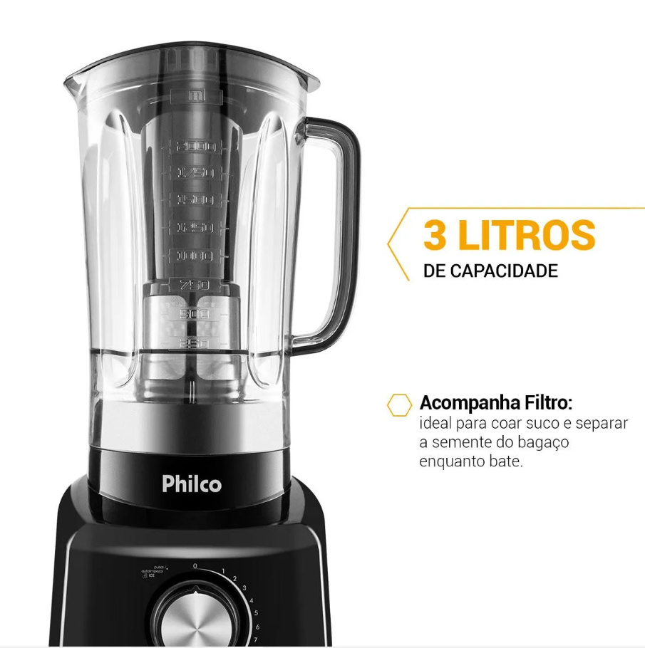Se tem algo que vai te surpreender é o Liquidificador Preto 1200W! Ao primeiro giro do seu botão, você irá se apaixonar! São 1200W de potência e 12 velocidades, além de função pulsar, para você ir muito além do esperado. Com capacidade máxima de 3 litros, não haverá limites para sua imaginação e criatividade. Conta com faca de 6 lâminas, que são ultra afiadas e resistentes,permitindo que você triture até gelo. A palavra coar não existirá mais no seu vocabulário, pois este maravilhoso liquidificador conta com filtro que separa o suco das sementes e bagaço. Se quiser adicionar mais algum ingrediente, enquanto está preparando sua receita, não tem problema, pois sua tampa com orifício lhe dá esse benefício. E para que sua única preocupação seja cozinhar suas deliciosas receitas, conta com base antiderrapante, trazendo muito mais segurança! • Chave eletrônica 12 velocidades + pulsar/autolimpeza • Copo com facas integrado de 6 lâminas • Alça do copo anatômica • Tampa que permite servir sem retirá-la (posições fechada e servir) • Tampinha dosadora graduada (centro da tampa).