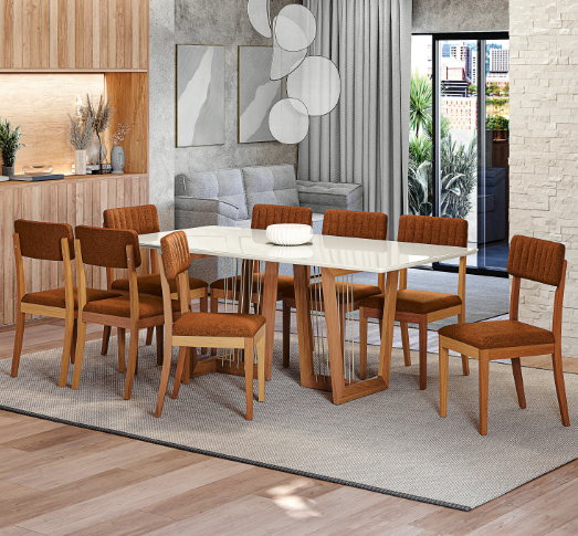 Aposte no Conjunto CSJ173CA da Kappesberg e aproveite todos os momentos em um espaço lindo e completo. Robusto e com um design moderno, a base é produzida em madeira de eucalipto, o que garante maior durabilidade e uma beleza única. Podendo ser montada de duas formas, ela é retangular, com destaque para o detalhe em corda, que garante um acabamento único e será o diferencial do seu espaço. Medindo 79,5cm de altura, 99,2cm de largura e 75cm de profundidade, ela se encaixa muito bem em ambientes amplos, e combinada ao tampo retangular com vidro, acomoda até oito pessoas. Em MDF de 25mm, ele possui bordas chanfradas, e pintado na cor off white, o diferencial fica por conta do vidro na mesma cor, completando seu design e garantindo ainda mais beleza e estilo para seu ambiente. Medindo 2m de comprimento e 1m de profundidade, garante beleza e estilo ao seu espaço. Já as cadeiras que compõem o conjunto, oito peças no modelo Telma, também em madeira de eucalipto, são entregues montadas, suportando até 120kg e combinando com todos os seus momentos. Medindo 92cm de altura, sendo 49cm a altura do assento, 48cm de largura e 54,5cm de profundidade, para mais comodidade, o assento e o encosto são estofados com espumas certificadas e recobertos com tecido boucle terracota, garantindo um toque suave e o máximo de conforto. O destaque fica para o detalhe de costura no encosto, que com acabamento curvo, proporciona um encaixe perfeito com as costas, garantindo beleza e mais comodidade em todos os momentos, deixando sua sala de jantar mais completa.